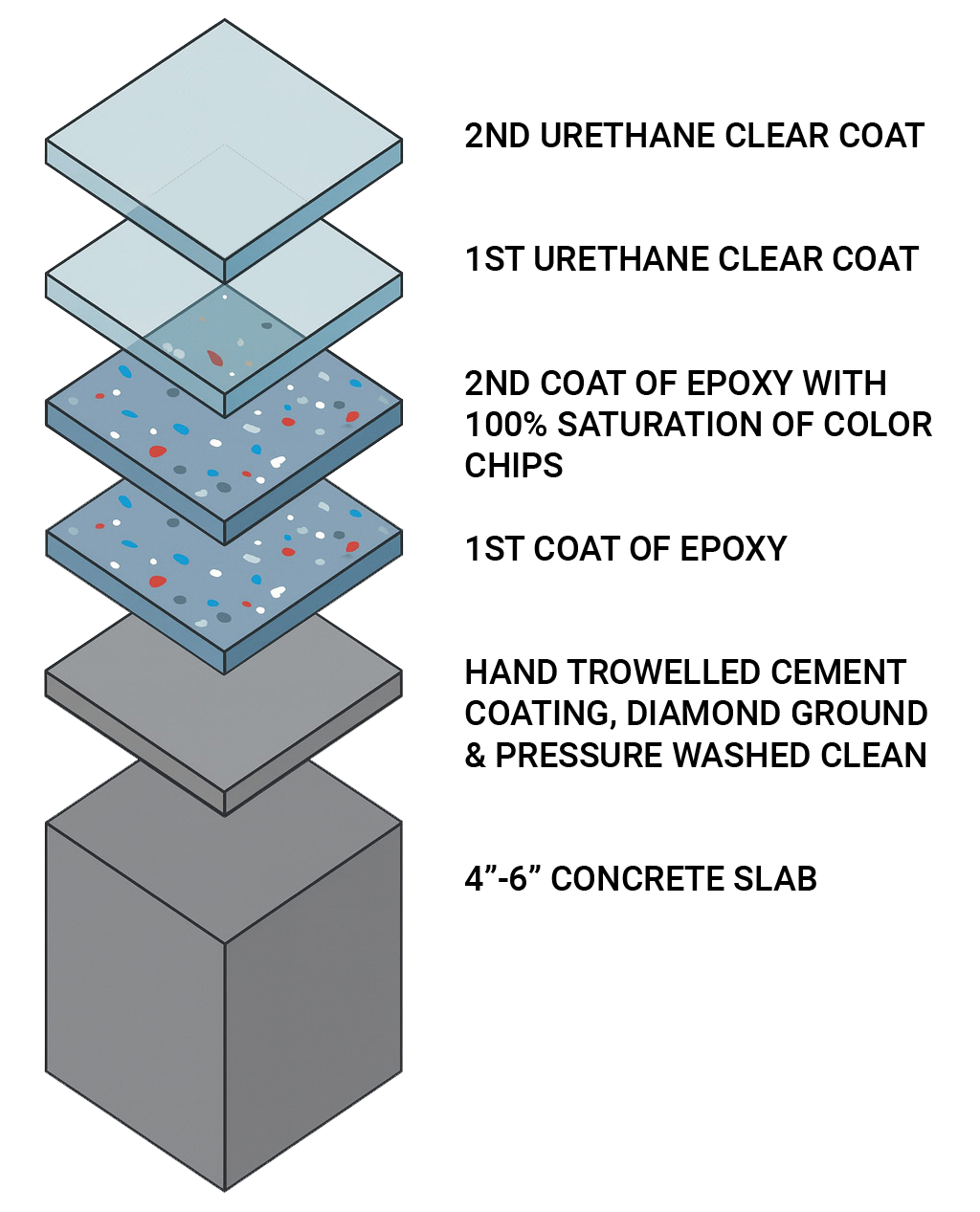 We start with a hand trowelled cement coating to fill any imperfections in the concrete. Two coats of epoxy are rolled and brushed on. The second coat of epoxy is saturated with color chips until rejection. The excess chips are then removed from the surface.