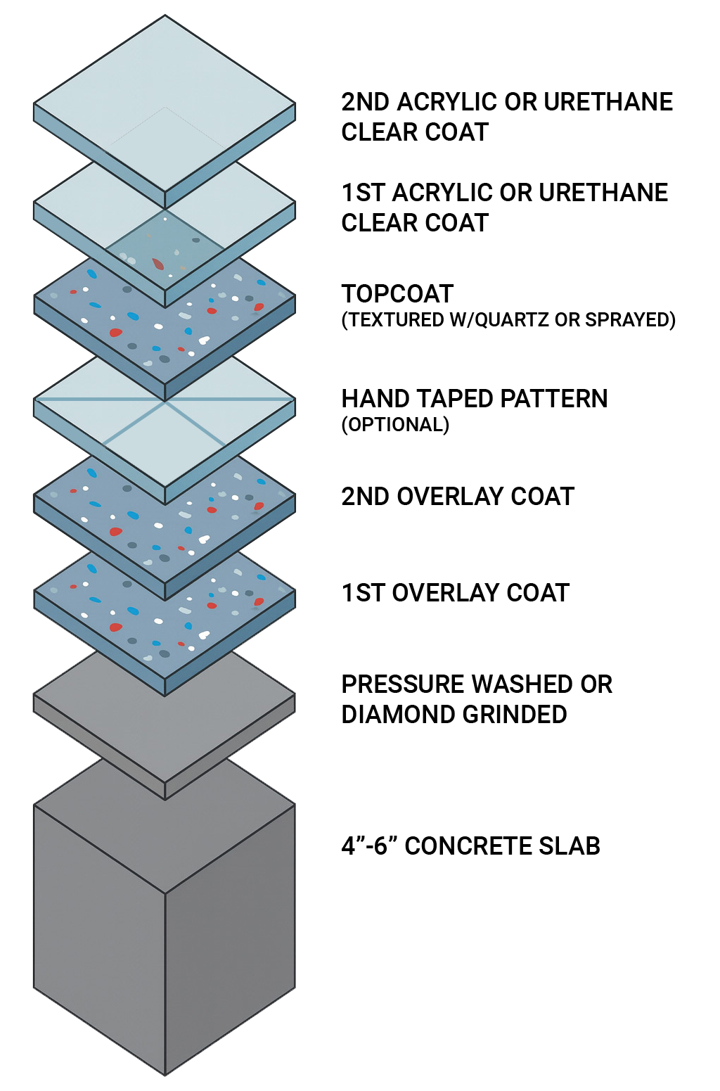 A minimum of three coats of Resiflex are applied in total. Two base coats are hand trowelled over the surface to create a resurfaced slab. The top coat is usually hand trowelled and quartz is added to the textured surface to display multiple colors. In some cases, our top coat is sprayed using a hopper gun especially for vertical and other surfaces that require extra texture.